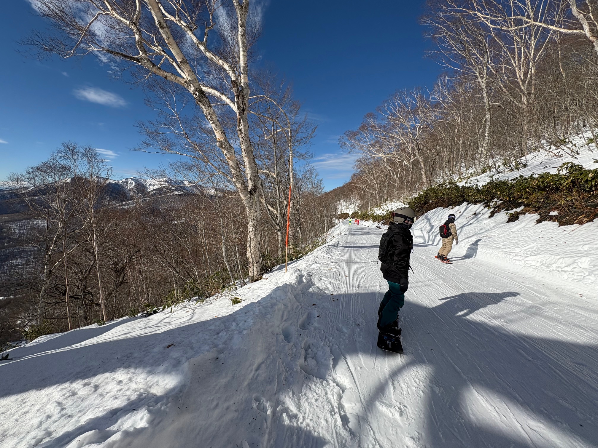 普段メインで滑っている「ミルキーウェイ」などのコースはクローズでしたが、西山エリアは一部ブッシュや土が出ているポイント以外はしっかりと雪があり、空いているコースで気持ちよく滑ることができました。