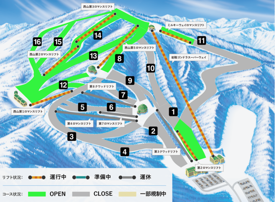 滑走日当日は、まだ積雪が十分ではなく、メインでオープンしているのはゲレンデ奥側の西山エリアでした。