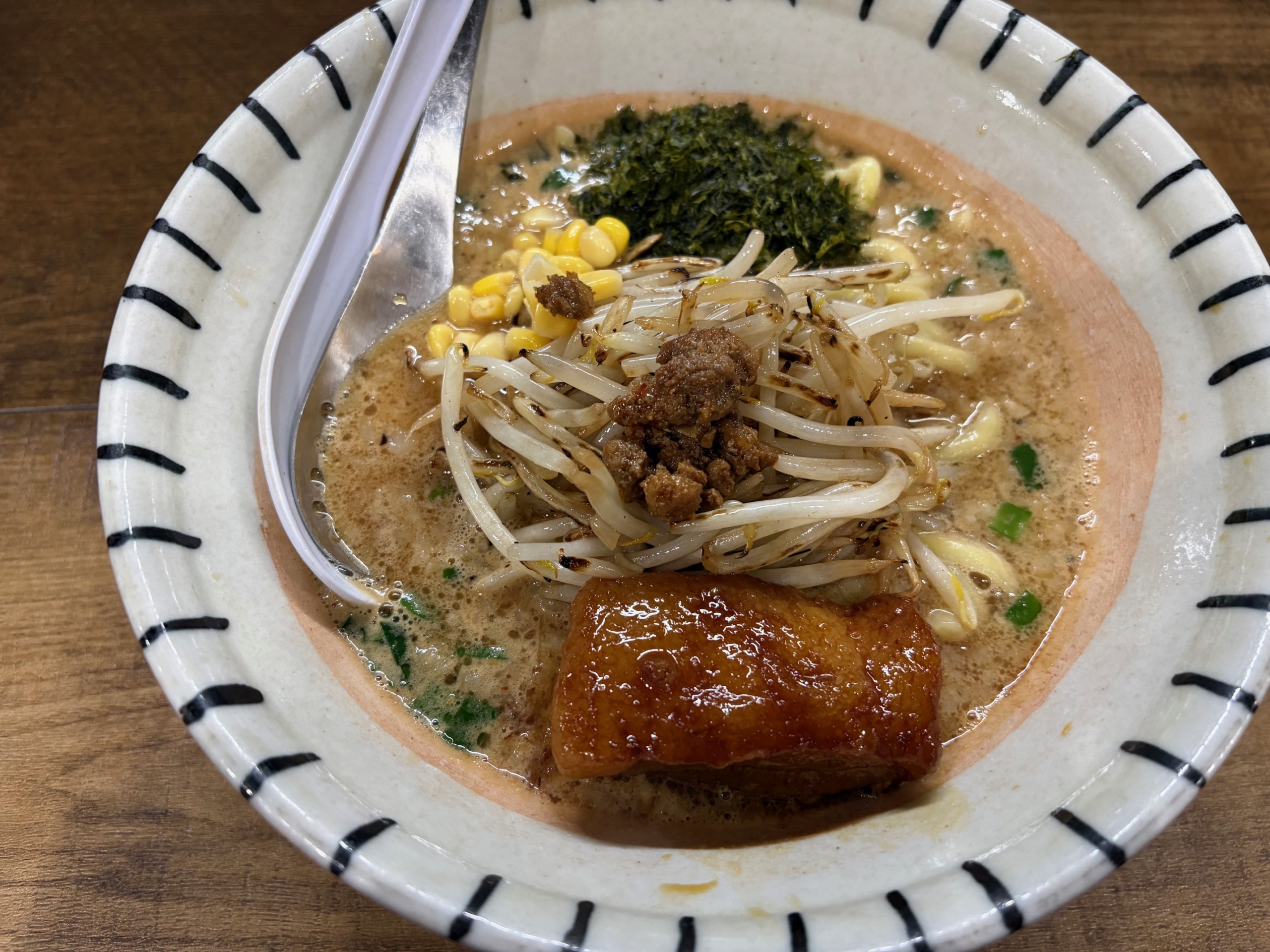 コーンのプチっとした甘さ、海苔の風味、刻みねぎの爽やかさが、濃厚なスープの良いアクセントになっています。