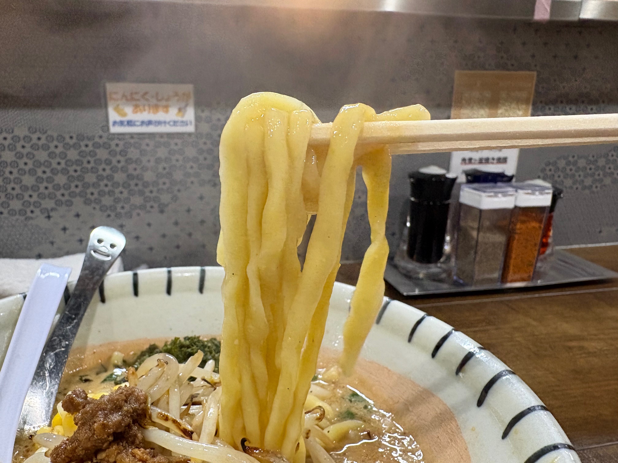 麺はスープに負けない中太〜やや太めのタイプで、噛むとムチっとした食感。
