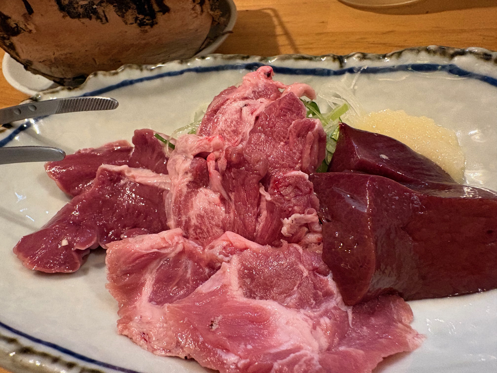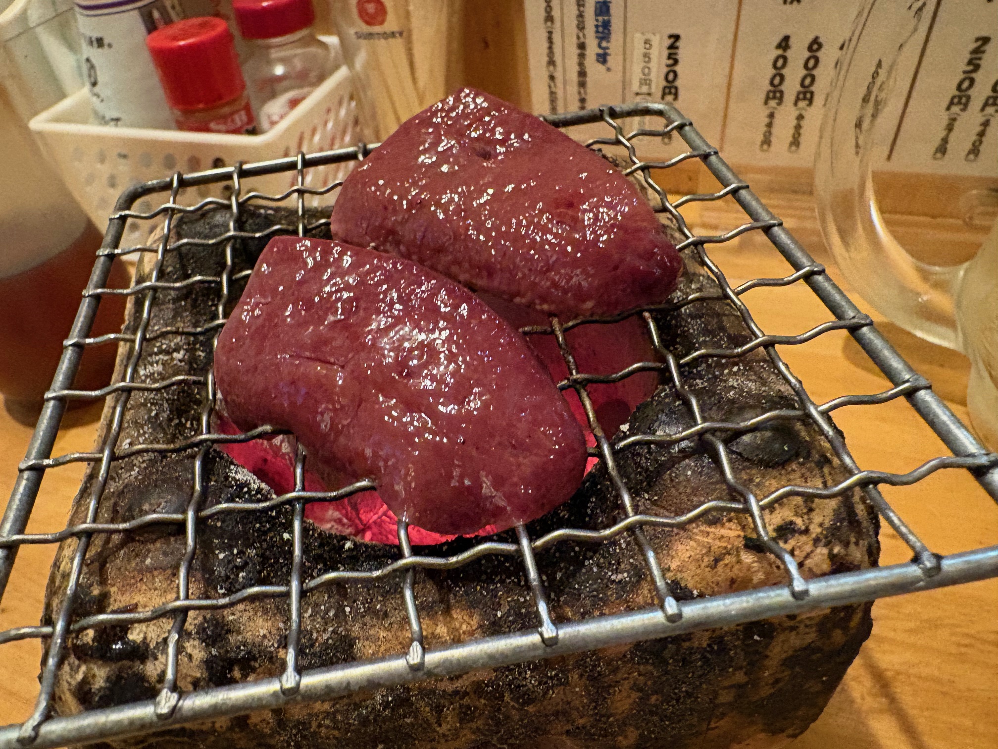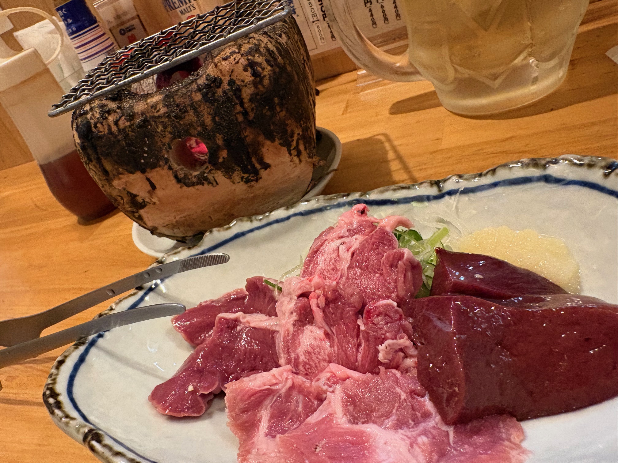 タン、レバー、ハツ、カシラなどの刺しが美しく盛り付けられ、一人用の小さな七輪と一緒に提供されます。