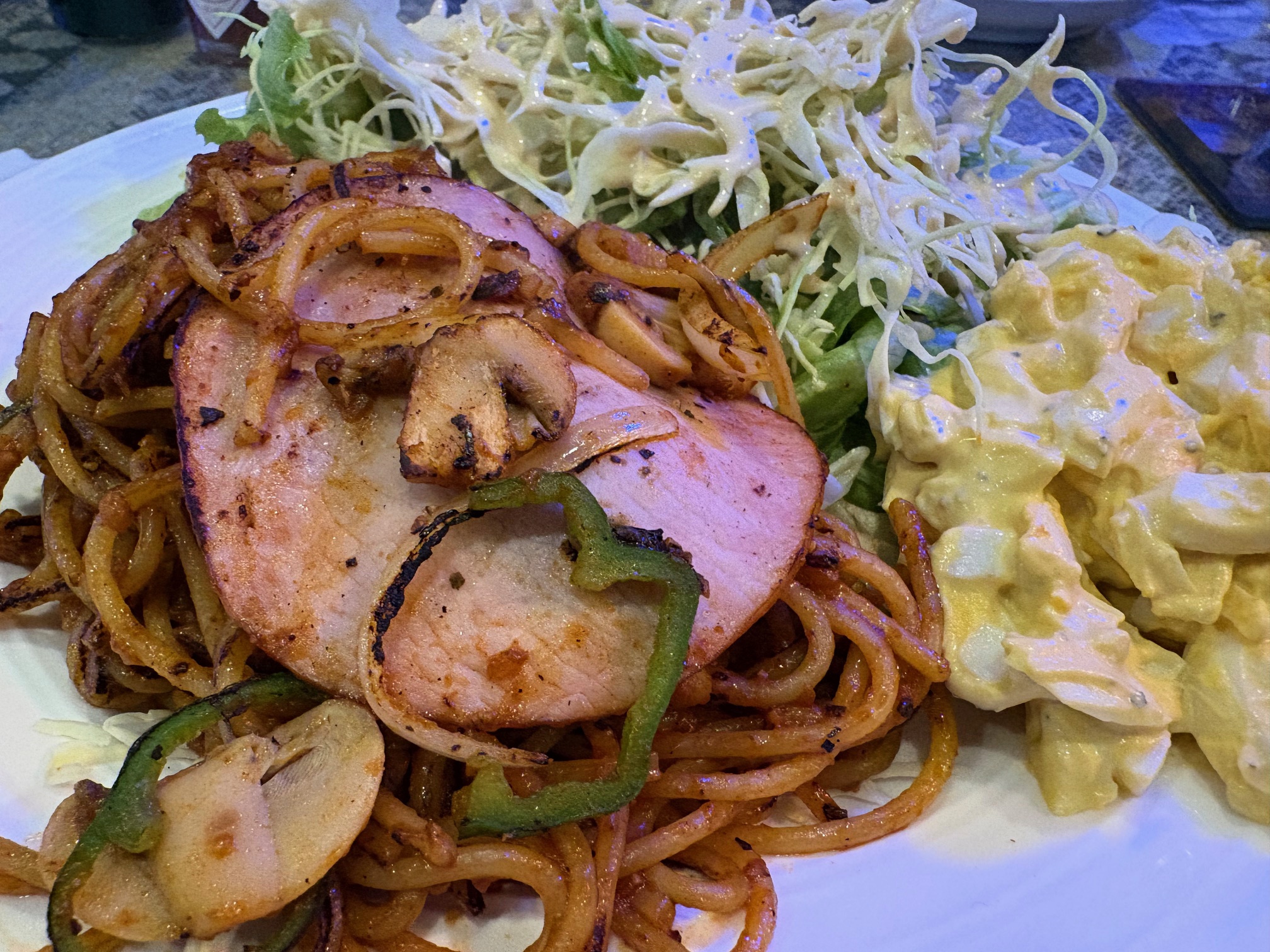 大きなお皿に、焼き目のついたスパゲッティとたっぷりの具材、そしてサラダがどんと盛られた、昔ながらの喫茶店スタイルです。